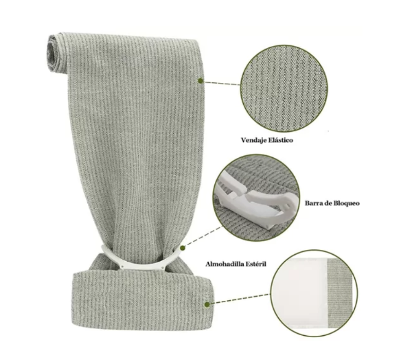 Este vendaje de compresión combina algodón médico absorbente con una banda elástica de alta resistencia, ofreciendo control inmediato de sangrados en brazos, piernas u otras áreas del cuerpo.